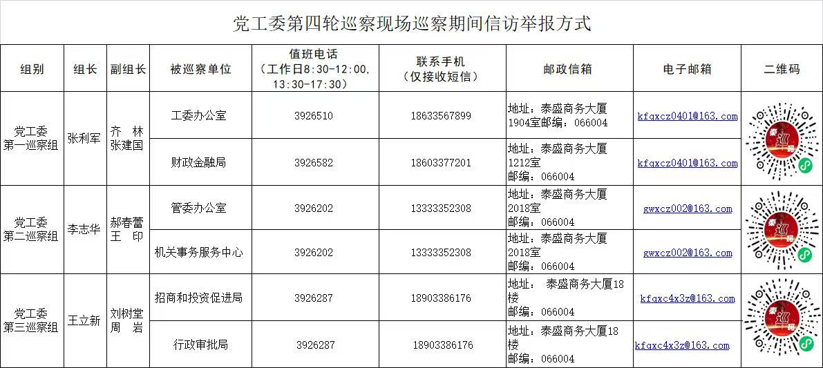 各党工委巡察组在被巡察单位现场巡察时间为2个月左右,巡察期间党工委巡察组将专门设值班电话、联系信箱、电子邮箱和信访举报二维码,主要受理反映被巡察党组织领导班子及其成员、下一级党组织领导班子主要负责人和重要岗位领导干部问题的举报和反映,重点是关于违反政治纪律、组织纪律、廉洁纪律、群众纪律、工作纪律、生活纪律以及违反中央八项规定及其实施细则精神等问题的来信来电来访。对关于个人诉求、涉法涉诉等问题的反映,将按照分级负责、属地管理原则,移交有关单位或部门处理。巡察组受理信访时间截止到2025年12月25日。