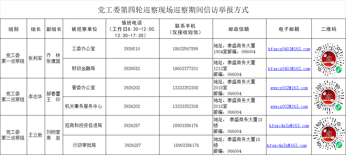 各党工委巡察组在被巡察单位现场巡察时间为2个月左右,巡察期间党工委巡察组将专门设值班电话、联系信箱、电子邮箱和信访举报二维码,主要受理反映被巡察党组织领导班子及其成员、下一级党组织领导班子主要负责人和重要岗位领导干部问题的举报和反映,重点是关于违反政治纪律、组织纪律、廉洁纪律、群众纪律、工作纪律、生活纪律以及违反中央八项规定及其实施细则精神等问题的来信来电来访。对关于个人诉求、涉法涉诉等问题的反映,将按照分级负责、属地管理原则,移交有关单位或部门处理。巡察组受理信访时间截止到2025年12月25日。